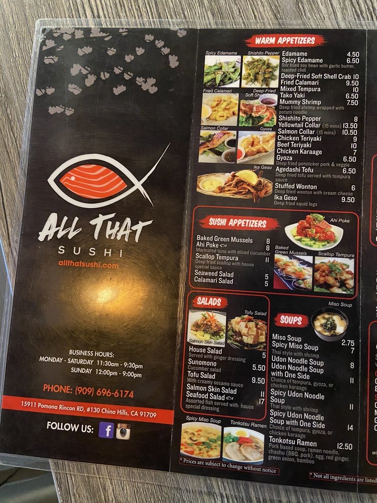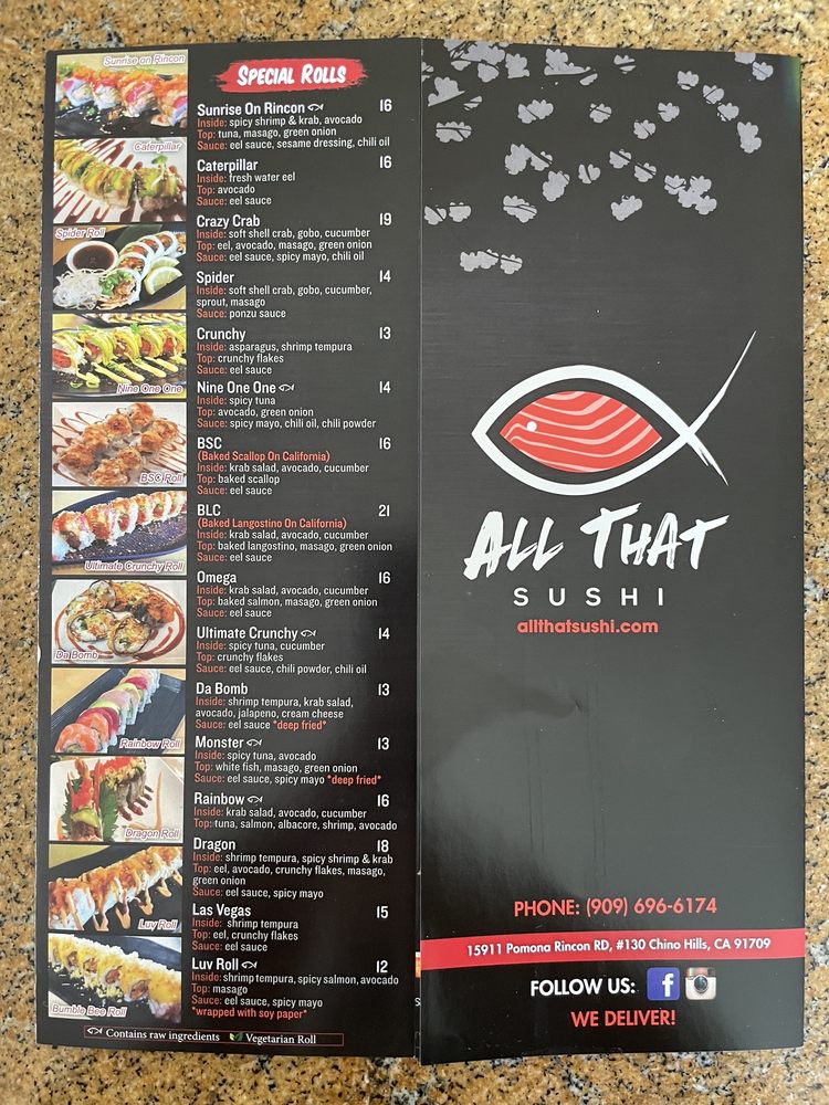 Welcome to All That Sushi, a vibrant gem nestled in Chino Hills, CA, where the flavors of Japan come alive! This trendy, casual eatery offers an impressive array of sushi options, making it a go-to spot for brunch, lunch, or dinner. Their menu features a delightful selection, including fresh nigiri and unique rolls like the Candy Cane and Las Vegas rolls, perfect for sushi aficionados seeking new experiences.